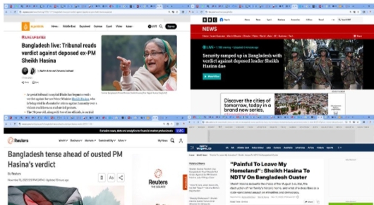 ‘ক্ষমতাচ্যুত নেত্রী শেখ হাসিনার বিরুদ্ধে রায় ঘোষণার আগে বাংলাদেশে নিরাপত্তা জোরদার করা হয়েছে’ শিরোনামে লাইভ সম্প্রচার শুরু করেছে ব্রিটিশ সংবাদমাধ্যম বিবিসি কাতারভিত্তিক সংবাদমাধ্যম আল জাজিরাও ‘ক্ষমতাচ্যুত প্রাক্তন প্রধানমন্ত্রী শেখ হাসিনার বিরুদ্ধে আদালতের রায় আজ’ শিরোনামে লাইভ সম্প্রচার শুরু করেছে।