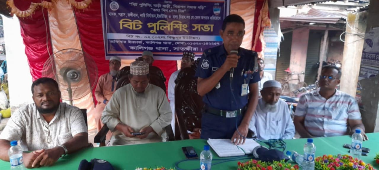 "বিট পুলিশিং বাড়ি বাড়ি নিরাপদ সমাজ গড়ি" এই স্লোগানকে সামনে রেখে সাতক্ষীরার কালিগঞ্জ উপজেলার বিষ্ণপুর ইউনিয়নের চৌমুহনী হাট চত্বরে মাদক, সন্ত্রাস, জঙ্গিবাদ, নারী নির্যাতন, ইভটিজিং, বাল্যবিবাহসহ যে কোন অপরাধ প্রতিরোধে বিট পুলিশিং সভা অনুষ্ঠিত হয়েছে। বুধবার (২৫ জুন) বিকাল ৫ টায় উপজেলা বিএনপির সাবেক ছাত্র বিষয়ক সম্পাদক ও বিষ্ণুপুর ইউপি"র চেয়ারম্যান জাহাঙ্গীর আলমের সভাপতিত্বে ও বিষ্ণুপুর ইউনিয়নের দ্বায়িত্বরত এস আই রাজীব সরদারের সঞ্চালনায় প্রধান অতিথির বক্তব্য রাখেন থানার পরিদর্শক (তদন্ত) হারুন অর রশিদ মৃধা। বিশেষ অতিথির বক্তব্য রাখেন উপজেলা বিএনপির সাবেক তথ্য বিষয়ক সম্পাদক ও বিষ্ণুপুর ইউনিয়ন বিএনপির সাবেক সিনিঃ যুগ্ম আহবায়ক এম হাফিজুর রহমান শিমুল, ইউনিয়ন জামায়ের সেক্রেটারী ও দারুল উধূম চৌমুহনী ফাজিল মাদ্রাসার অধ্যক্ষ (ভারঃ) মাওলানা মিজানুর রহমান, সাবেক অধ্যক্ষ মাওলানা আব্দুল কাদের হেলালী কাজলা গরীবুল্লাহ দাখিল মাদ্রাসার সুপার জামায়াত নেতা মাওঃ শওকত হোসেন, চৌমুহনী বাজার বনিক সমিতির সভাপতি আব্দুল কাদের, গ্রাম্য চিকিৎসক শ্যামল চন্দ্র ও অসিত কুমার মন্ডল। এসময়ে উপস্থিত ছিলেন কালিগঞ্জ থানার সেকেন্ড অফিসার সুদেব পাল, উপ পরিদর্শক প্রদীপ, উপ পরিদর্শক নাজমুল, গান্ধুলিয়া দাখিল মাদ্রাসার সুপার মাওঃ রুহুল আমিন, ইউনিয়ন বিএনপির সাবেক সদস্য সচিব আজিজুর রহমান, সাবেক সেক্রেটারী কামরুজ্জামান হাবিব, ইউনিয়ন যুবদলের সভাপতি শেখ আব্দুল করিম, জামায়াতে ইসলামীর যুব বিভাগের সভাপতি শেখ আব্দুর রহিমসহ বিএনপি ও জামায়াতের বিভিন্ন পর্যায়ের নেতাকর্মী ও শতশত বিভিন্ন শ্রেনী পেশার মানুষ।