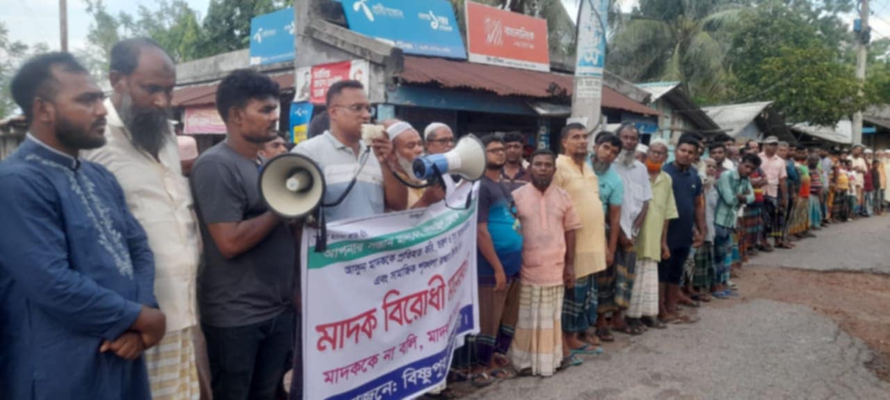 কালিগঞ্জ প্রতিনিধিঃ সাতক্ষীরার কালিগঞ্জ উপজেলার বিষ্ণুপুর ইউনিয়নের বন্দকাটি গ্রামের চিহ্নিত মাদক ব্যবসায়ী ও বহু অপকর্মের হোতা ওবায়দুল্লাহ গাজী তার সহযোগীদের গ্রেপ্তার ও দৃষ্টান্তমূলক শাস্তির দাবিতে মানববন্ধন অনুষ্ঠিত হয়েছে। সোমবার (২৩ জুন) বিকালে ইউনিয়নের বন্দকাটি গোরস্থান মোড়ে এই মানববন্ধনের আয়োজন করেন ইউনিয়নবাসী।মানববন্ধনে বন্দকাটি গ্রামের আব্দুল মজিদ গাজীর ছেলে ওবায়দুল্লাহ গাজী (৪৫) মনতেজ মোড়লের ছেলে এনামুল মোড়ল (৩২) ও আব্দুল গাজীর ছেলে শাহিন গাজী (৩০) এই তিনজনকে এলাকার মাদক বিস্তারের মূল হোতা হিসেবে চিহ্নিত করে তাদের বিরুদ্ধে কঠোরভাবে আইনগত ব্যবস্থা গ্রহণের দাবি জানানো হয়। মাহমুদ মোস্তফার সঞ্চালনায় মানববন্ধনে বক্তব্য রাখেন বিষ্ণুপুর ইউপি চেয়ারম্যান জাহাঙ্গীর আলম, ইউপি সদস্য আব্দুস সালাম, সাবেক ইউপি সদস্য মনিরুজ্জামান মনিসহ গন্যমচন্য ব্যাক্তিবর্গ। মানববন্ধনে শতাধিক স্থানীয় সাধারণ জনগণ উপস্থিত ছিলেন। বক্তারা বলেন দীর্ঘদিন ধরে এই চক্র মাদকের রমরমা ব্যবসা চালিয়ে আসলেও ছিলো ধরাছোয়ার বাইরে। এতে এলাকার যুবসমাজ ধ্বংসের মুখে পড়েছে। উল্লেখ্য, গোপন সংবাদের ভিত্তিতে গত ২২ জুন আইনশৃঙ্খলা বাহিনীর অভিযানে ইয়াবাসহ ওবায়দুল্লাহ গাজীকে গ্রেপ্তার করা হয়েছে। তবে তার দুই সহযোগী এখনো পলাতক রয়েছে। মানববন্ধনে এলাকাবাসী দাবি করেন, পলাতক আসামিদের দ্রুত গ্রেপ্তার করে কঠোর শাস্তির আওতায় আনতে হবে এবং এলাকায় মাদকমুক্ত পরিবেশ নিশ্চিত করতে প্রশাসনের আরও কঠোর নজরদারি প্রয়োজন।