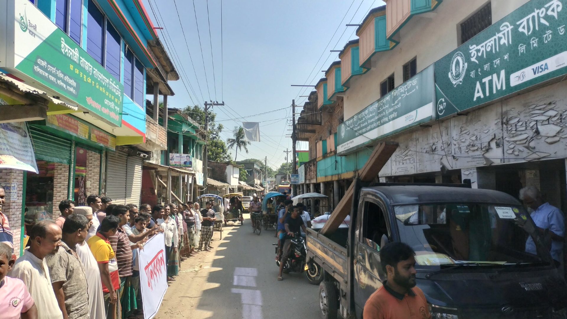 সাতক্ষীরার কালিগঞ্জ উপজেলার কৃষ্ণনগর বাজার থেকে ইসলামী ব্যাংকের এটিএম বুথ প্রত্যাহারের সিদ্ধান্তের প্রতিবাদে মানববন্ধন করেছে স্থানীয় ব্যবসায়ীরা।