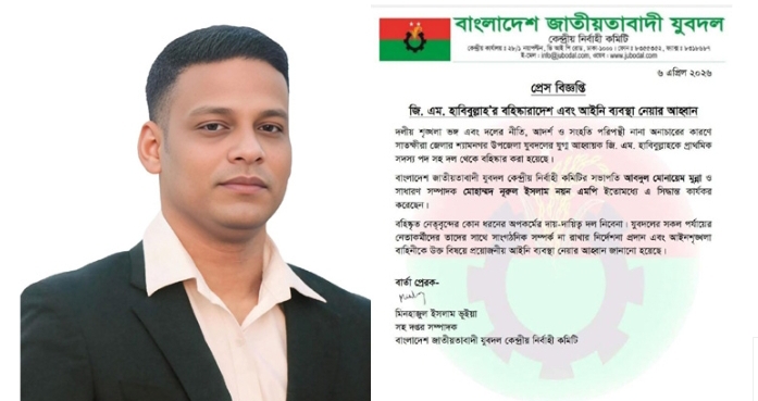এতে বলা হয়, দলীয় শৃঙ্খলা ভঙ্গ এবং নীতি-আদর্শ পরিপন্থী কর্মকান্ডের অভিযোগে শ্যামনগর উপজেলা যুবদলের যুগ্ম আহ্বায়ক জি.এম হাবিবুল্লাহকে প্রাথমিক সদস্যপদসহ দল থেকে বহিষ্কার করা হয়েছে।