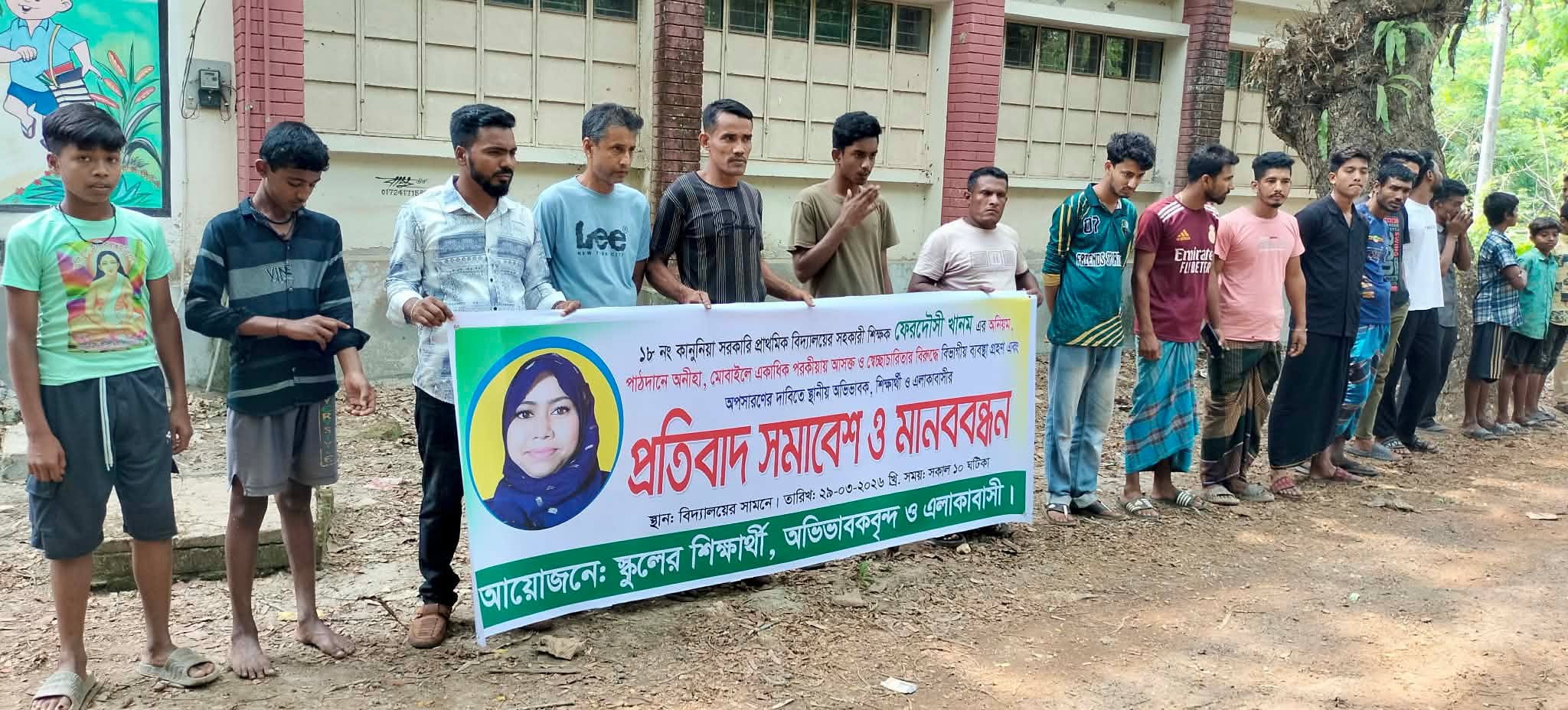 আজ রবিবার (২৯ মার্চ) সকাল ১১টায় উপজেলার ১৮ নম্বর কানুনিয়া সরকারি প্রাথমিক বিদ্যালয়ের সামনে এ কর্মসূচি পালন করা হয়। অভিযোগকারী শিক্ষিকা ফেরদৌসী খানম বর্তমানে ওই বিদ্যালয়ে সহকারী শিক্ষিকা হিসেবে ডেপুটেশনে কর্মরত রয়েছেন।