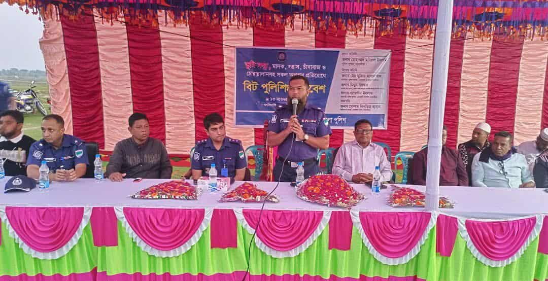আব্দুল্লাহ আল মামুন,দেবহাটা সাতক্ষীরাঃ সাতক্ষীরার অতিরিক্ত পুলিশ সুপার মুকিত হাসান খাঁন বলেছেন, ভূমিদস্যু, সন্ত্রাসী ও অপরাধীদের কোন দল নেই। তারা দেশ ও জনগনের শত্রু। ভূমিদস্যু ও সন্ত্রাস সমাজ বিরোধীদের দমন নিপিড়ন পুলিশ সর্বদা তৎপর। তিনি ভূমিহীন জনপদকে শান্তিতে রাখার জন্য এলাকার সকল মানুষদের সহযোগীতা কামনা করেন এবং অতি দ্রুত উক্ত এলাকায় একটি পুলিশ ক্যাম্প স্থাপন করা হবে বলে জানান। দেবহাটা উপজেলার ভূমিহীন জনপদ খলিশাখালীতে ভূমিদস্যু, মাদক, সন্ত্রাস, চাদাবাজ ও চোরাচালান বিরোধী বিট পুলিশিং সমাবেশে প্রধান অতিথির বক্তব্যে মুকিত হাসান খাঁন উপরোক্ত কথাগুলো বলেন। বৃহস্পতিবার ১৩ নভেম্বর বিকাল ৪টায় অনুষ্ঠিত উক্ত সমাবেশে সভাপতিত্ব করেন দেবহাটা থানার অফিসার ইনচার্জ গোলাম কিবরিয়া হাসান। বিশেষ অতিথি ছিলেন যথাক্রমে দেবহাটা সার্কেলের সহকারী পুলিশ সুপার বায়েজিদ ইসলাম। এসময় আরো উপস্থিত ছিলেন ও বক্তব্য রাখেন দেবহাটা থানার ওসি (তদন্ত) নজরুল ইসলাম, দেবহাটা উপজেলা বিএনপির সাবেক সদস্য সচিব ও সাতক্ষীরা জেলা বিএনপির সদস্য মহিউদ্দিন সিদ্দিকী, দেবহাটা উপজেলা বিএনপির সাবেক সাধারণ সম্পাদক ও পারুলিয়া ইউপি চেয়ারম্যান গোলাম ফারুক বাবু, সখিপুর ইউনিয়ন বিএনপির সভাপতি এবাদুল ইসলাম, উপজেলা যুবদলের আহবায়ক কামরুজ্জামান কামরুল, নওয়াপাড়া ইউনিয়ন বিএনপির সাধারন সম্পাদক রাজিব হোসেন রাজু ও দেবহাটা থানার সেকেন্ড অফিসার এসআই লেলিন বিশ্বাস প্রমুখ।