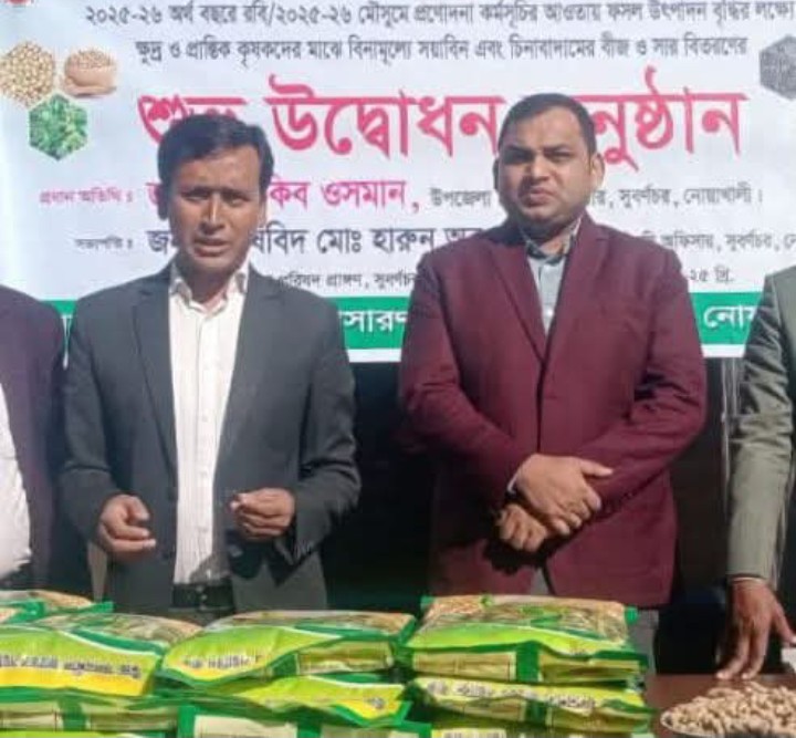 মোঃ আবুল বাসার,নিজস্ব প্রতিনিধি নোয়াখালীঃ নোয়াখালীর সুবর্ণচর উপজেলায় টেকসই কৃষি উৎপাদন বৃদ্ধি ও কৃষকদের উদ্বুদ্ধ করতে উপজেলা কৃষি অফিসের উদ্যোগে সাধারণ কৃষকদের মাঝে বিনামূল্যে বীজ ও সার বিতরণ কার্যক্রম অনুষ্ঠিত হয়েছে।