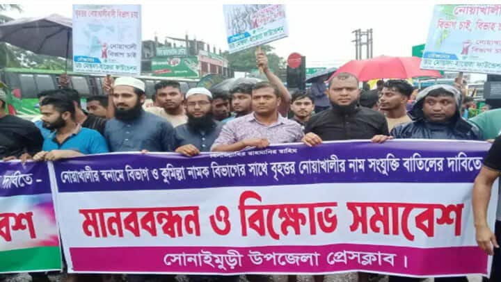 মোঃ আবুল বাসার,নোয়াখালী প্রতিনিধিঃনোয়াখালীকে বিভাগ ঘোষণার দাবিতে সোনাইমুড়ীতে মানববন্ধন ও বিক্ষোভ করে আন্দোলনকারীরা।
