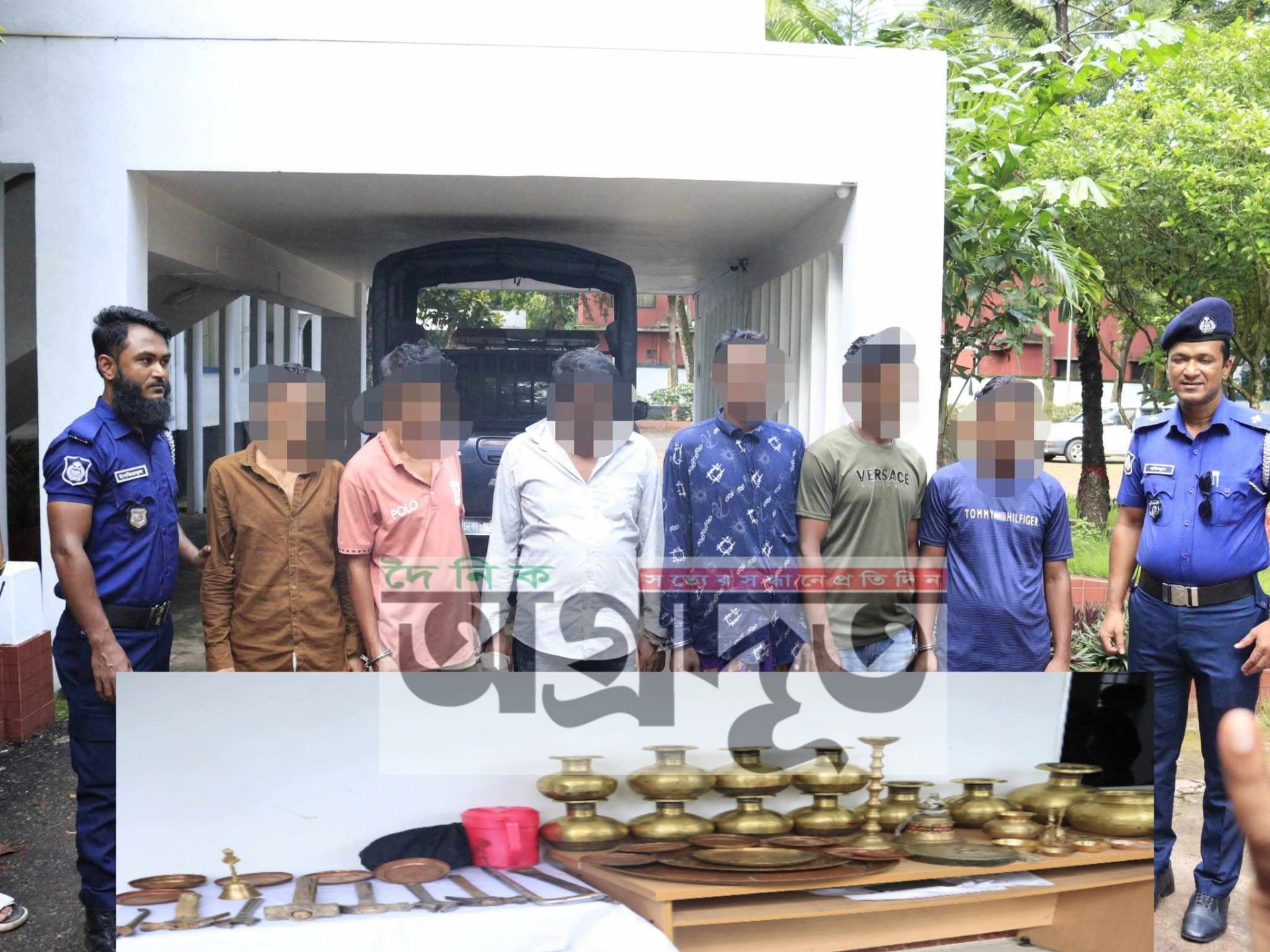 উদ্ধারকৃত মালামালের মধ্যে রয়েছে ১১টি পিতলের ঘট, ২টি কাসার ঘণ্টা, ২টি পুস্প থালি, ১টি পিতলের প্রদীপ, ৮টি কাসার থালা, ৫টি কাসার বাটি, ২ সেট চিপ কোষা এবং ১টি পিতলের কলসি।