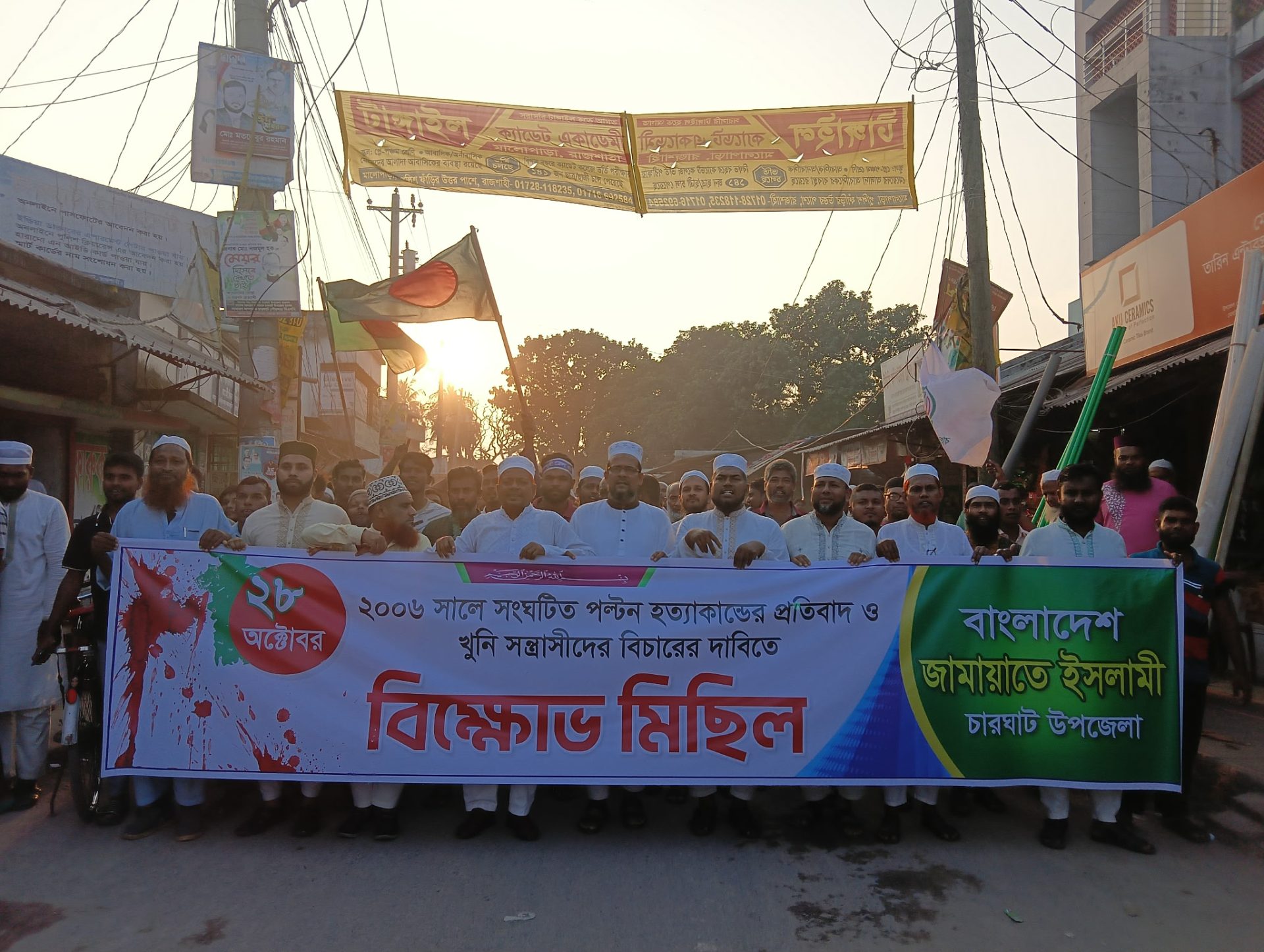মৌসুমী দাস,চারঘাট প্রতিনিধিঃ২০০৬ সালের ২৮ অক্টোবরে সংঘটিত পল্টন হত্যাকান্ডের প্রতিবাদ ও খুনি সন্ত্রাসীদের বিচারের দাবিতে রাজশাহীর চারঘাট উপজেলা জামায়াতের বিক্ষোভ মিছিল ও সমাবেশ অনুষ্ঠিত হয়েছে।