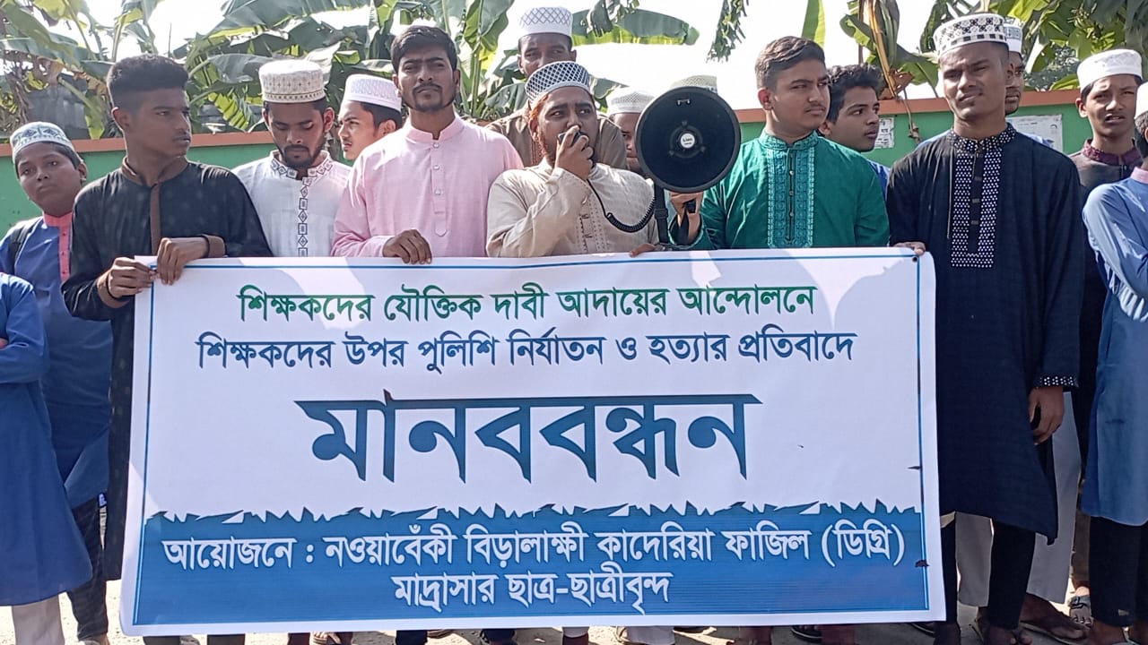 সোমবার সকাল ৯ ঘটিকায় নওয়াবেঁকী বাজার স্ট্যান্ডে শিক্ষকদের যৌক্তিক দাবি আদায়ের আন্দোলনে শিক্ষকদের উপর পুলিশ নির্যাতন ও হত্যার প্রতিবাদে মানববন্ধন করেছে নওয়াবেঁকী বিড়ালাক্ষী কাদেরিয়া ফাজিল ডিগ্রী মাদ্রাসা ও ছাত্র-ছাত্রী বৃন্দ ।
