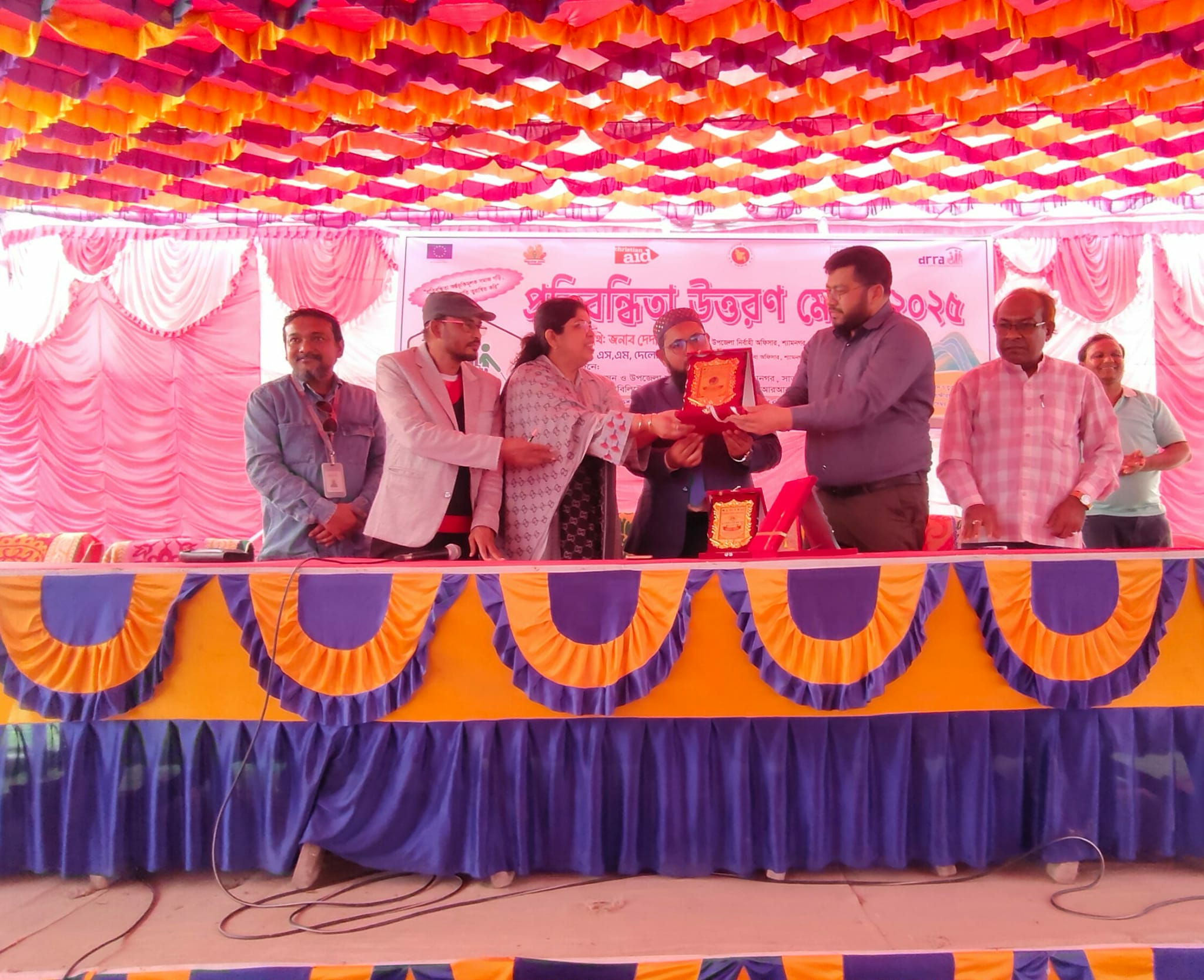 বিশেষ প্রতিনিধি।। সাতক্ষীরা'র শ্যামনগর উপজেলায় ৩৪ তম আন্তর্জাতিক এবং ২৭ তম জাতীয় প্রতিবন্ধী দিবস ২০২৫ উপলক্ষে ২দিন ব্যাপি প্রতিবন্ধিতা উত্তরণ মেলার সমাপনী ও সম্মাননা ক্রেষ্ট বিতরণ অনুষ্ঠান অনুষ্ঠিত হয়েছে। গতকাল বৃহঃবার ৩.০০ টায় উপজেলা প্রশাসন, উপজেলা সমাজসেবা কার্যালয় ও ডিজএ্যাবল্ড রিহ্যাবিলিটেশন এন্ড রিসার্চ এসোসিয়েন (ডিআরআরএ)এর পিএসিই প্রকল্পের আয়োজনে মানুষের জন্য ফাউন্ডেশন ও ক্রিশ্চিয়ান এইড এর সহযোগিতায় উপজেলা পরিষদ চত্বরে উপজেলা প্রশাসনের কর্মকর্তা, বিভিন্ন দপ্তর প্রধানগণ, জনপ্রতিনিধি, বিভিন্ন পর্যায়ের নেতৃবৃন্দ, সুশীল সমাজের সুধীবৃন্দ, এনজিও প্রতিনিধি, প্রতিবন্ধী ব্যক্তি ও তাদের পিতা-মাতাদের উপস্থিতিতে প্রতিবন্ধিতা উত্তরণ মেলা সমাপনী অনুষ্ঠানে উপজেলা সমাজসেবা অফিসার দেলোয়ার হোসেন এর সভাপতিত্বে প্রধান অতিথি হিসেবে মেলায় প্রতিবন্ধী ব্যক্তিদের তৈরির বিভিন্ন পণ্যর ১৫ টি স্টল পরিদর্শন করেন ও তাদেরকে সম্মাননা স্মারক ক্রেস্ট প্রদান করেন এবং প্রতিবন্ধী ব্যক্তির অধিকার বিষয়ে বক্তব্য রাখেন উপজেলা সহকারি কমিশনার ভূমি জনাব রাশেদ হোসাইন । প্রতিবন্ধী উত্তরণ মেলায় সম্নানিত অতিথি হিসাবে উপস্থিত ছিলেন ডিআরআরএ এর নির্বাহী পরিচালক ফরিদা ইয়াসমীন।এ সময় তিনি বলেন, প্রতিবন্ধী ব্যক্তিরা আজ মেলায় তাদের সক্ষমতা প্রমাণ করেছে। সুতরাং যেকোন উন্নয়নমূলক কাজে প্রতিবন্ধী ব্যক্তির অংশগ্রহণ প্রয়োজন। এসময় বিশেষ অতিথি হিসেবে উপস্থিত ছিলেন সিনিয়র সাংবাদিক এস কে সিরাজ, ডিআরআর এর সিইও জনাব রওনক হাসান, টেকনিক্যাল কোঅর্ডিনেটর দেবেশ দাস, ম্যানেজার শামিম আহমেদ,প্রকল্প সমন্বয়কারী জি এম নুরুন্নবী হাসান, প্রমুখ।
