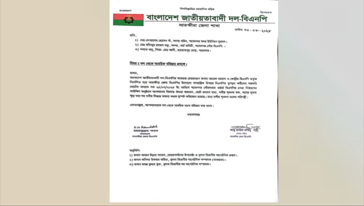 বহিষ্কারাদেশে বলা হয়, গত ২৫ জুলাই বাংলাদেশ জাতীয়তাবাদী দল-বিএনপির ভারপ্রাপ্ত চেয়ারম্যান তারেক রহমান ও কেন্দ্রীয় বিএনপি কর্তৃক নির্দেশিত হয়ে সাতক্ষীরা জেলা বিএনপির উদ্যোগে গণতান্ত্রিক উপায়ে বিএনপির তৃণমূল কর্মীদের সরাসরি ভোটের মাধ্যমে শ্যামনগর পৌরসভার ওয়ার্ড বিএনপির নেতা নির্ধারণের কাউন্সিল অনুষ্ঠানে আপনাদের বিরুদ্ধে ঔদ্ধত্যপূর্ণ আচরণ, ভোট প্রদানে বাধা, দলীয় শৃঙ্খলা ভঙ্গ, দলের সুনাম ক্ষুণ্ন করাসহ দলীয় সিদ্ধান্ত অমান্য করার সুস্পষ্ট অভিযোগ রয়েছে। যা দলীয় শৃঙ্খলা ভঙ্গের পরিপন্থী। এমতাবস্থায়, আপনাদেরকে দল থেকে সাময়িকভাবে বহিষ্কার করা হলো।