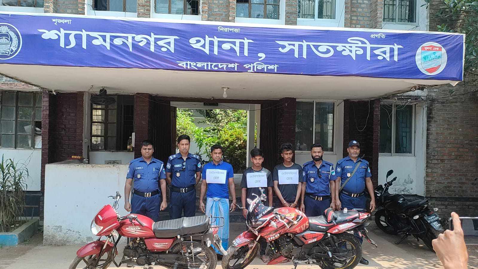 এম কামরুজ্জামান,শ্যামনগর সাতক্ষীরা প্রতিনিধিঃশ্যামনগর পৌরসভার বাদঘাটা এলাকার আব্দুল হামিদের ছেলে মোটরসাইকেল মালিক সাইফুল ইসলাম জানান, ২১ মার্চ সকাল ১১টার দিকে শ্যামনগর উপজেলা পশু হাসপাতালের সন্নিকটে মডার্ন ক্লিনিকের গলি থেকে তার ব্যবহৃত ডায়াং ৮০ সিসি মোটরসাইকেলটি চুরি হয়। এ ঘটনায় শ্যামনগর থানায় অজ্ঞাতনামা আসামি করে লিখিত অভিযোগ দায়ের করেন । সিসি ক্যামেরার ফুঁটেজসহ চুরির ঘটনাটি গণমাধ্যমে প্রকাশিত হলে ওই ফুঁটেজ দেখে শনিবার সকালে কালিগঞ্জ থেকে একাধিক ব্যক্তি চোর শনাক্ত করে শ্যামনগর থানাকে অভিহিত করেন। এ সংবাদ পেয়ে শ্যামনগর থানার এস আই অমিত ও এ এস আই দিপক মন্ডল সঙ্গীয় ফোর্স নিয়ে কালিগঞ্জ থানাধীন মহৎপুর গ্রামের নুরুজ্জামানের ছেলে শাহেদ গাজী(১৬) একই গ্রামের ছেলে এন্ড কলেজের শেখ রফিকুল ইসলামের ছেলে শরিফুল ইসলাম (৩৭) ও দেয়া গ্রামের শরিফুল ইসলামের ছেলে পাউখালী টেকনিক্যাল স্কুল এন্ড কলেজের ছাত্র শাহেদ হাসান(১৬) কে দেয়া গ্রাম থেকে আটক করে ও একই গ্রামের দুঃখের ছেলে আলী হোসেন(১৫) পলাতক রয়েছে। পরবর্তীতে তাদের তথ্যের ভিত্তিতে একই জায়গা থেকে চোরাই কাজে ব্যবহৃত একটি টিভিএস কোম্পানির অ্যাপাচি মোটরসাইকেল ও চুরি হওয়া মোটরসাইকেলটি উদ্ধার করেন। এ ঘটনায় আটককৃত ৪ জন সহ কয়েকজন অজ্ঞতানামা আসামি করে শ্যামনগর থানায় নিয়মিত মামলা হয়েছে। যার নং ২৮ তারিখ ২৪ মার্চ। শ্যামনগর থানার অফিসার ইনচার্জ আবুল কালাম আজাদ এর সাথে মুঠোফোনে কথা হলে তিনি ঘটনার সত্যতা স্বীকার করেন বলেন আসামিদের কোর্ট হাজতে প্রেরণ করা হয়েছে।