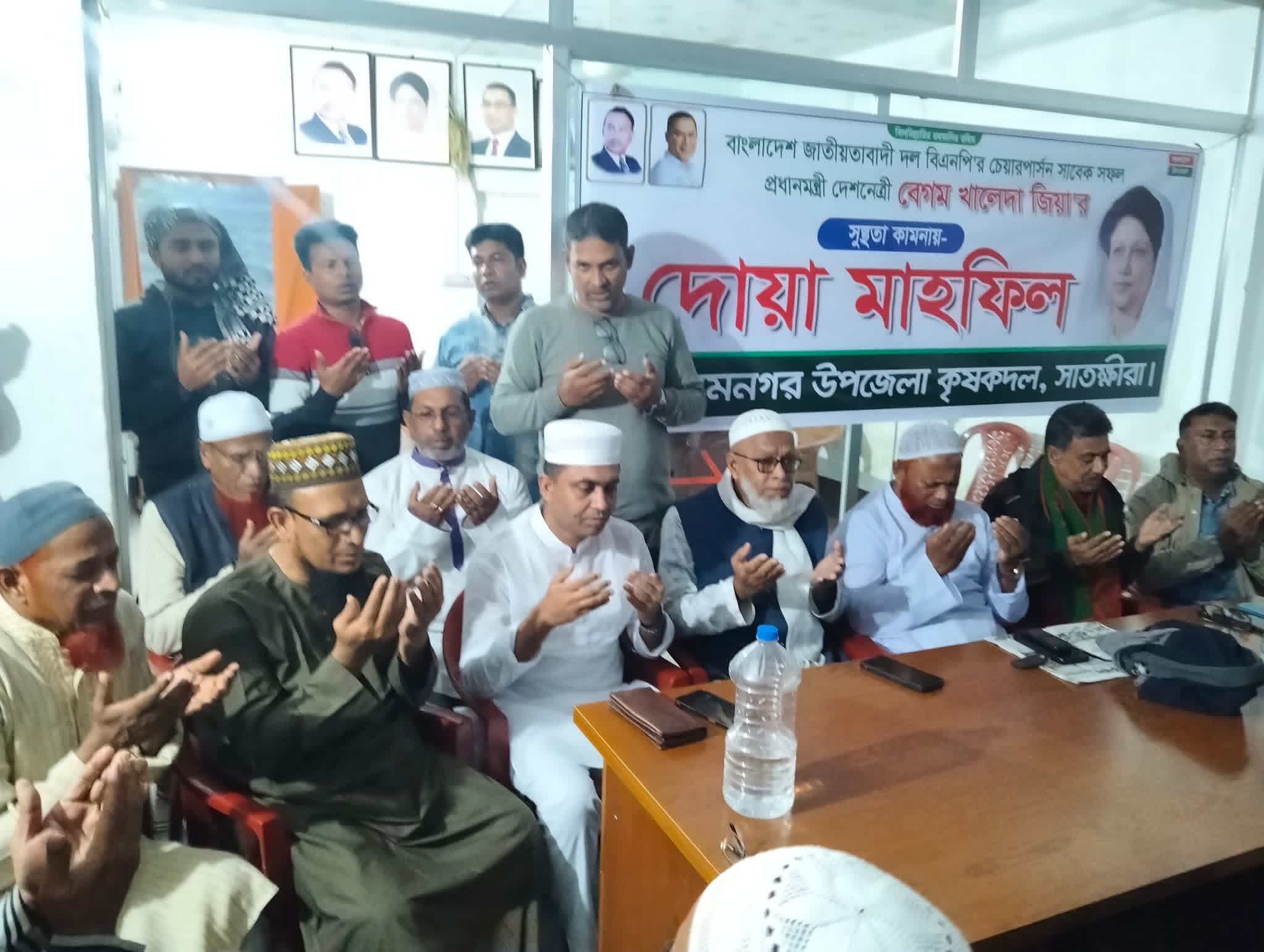 মনিরুজ্জামান জুলেট,শ্যামনগর সাতক্ষীরাঃ শনিবার (২৯ নভেম্বর) বিকাল ৫ টায় শ্যামনগর উপজেলা বিএনপি'র উদ্যোগে বিএনপির স্থায়ী কার্যালয়ে বিএনপি'র চেয়ারপার্সন ও সাবেক প্রধানমন্ত্রী বেগম খালেদা জিয়ার সুস্থতা কামনায় দোয়া মাহফিল অনুষ্ঠিত হয়।