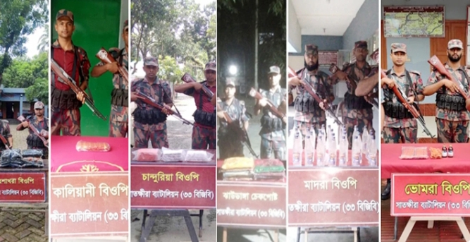 গতকাল বৃহস্পতিবার সাতক্ষীরা ব্যাটালিয়ন (৩৩ বিজিবি) এর অধীনস্থ ঝাউডাঙ্গা বিশেষ ক্যাম্প, মাদরা, কালিয়ানী, চান্দুরিয়া, ঘোনা, কাকডাঙ্গা, পদ্মশাখরা, সুলতানপুর, তলুইগাছা ও ভোমরা বিওপির দায়িত্বপূর্ণ এলাকায় অভিযান চালিয়ে এসব মালামাল আটক করা হয়।
