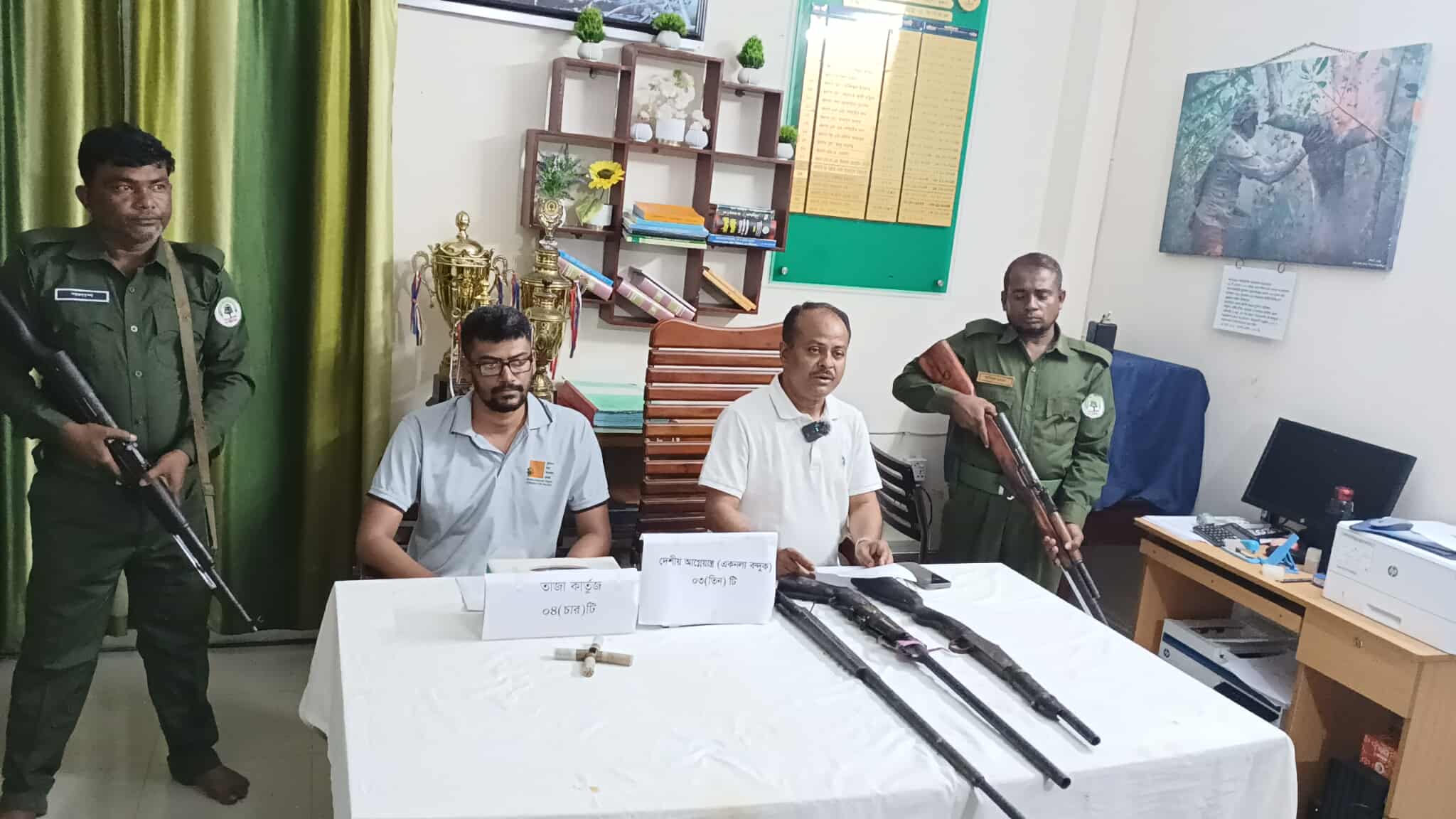 পরবর্তীতে ঘটনাস্থল ও আশপাশ এলাকায় তল্লাশি চালিয়ে তিনটি দেশীয় অস্ত্র এবং ৪টি কার্তুজ উদ্ধার করা হয়। উদ্ধারকৃত আলামত বন বিভাগের হেফাজতে নেওয়া হয়েছে।