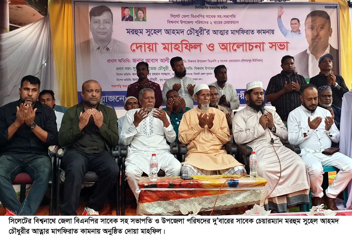 মিজানুর রহমান মিজান,(সিলেট)বিশ্বনাথ প্রতিনিধি:‘ধনী-গরীব সর্বমহলের মানুষের সাথে সুসর্ম্পক রেখে পথচলার কারণেই বিশ্বনাথের মানুষ বার বার সুহেল আহমদ চৌধুরী উপজেলা পরিষদের চেয়ারম্যান নির্বাচিত করে ছিলেন। নিজের কর্মগুনেই সুহেল চৌধুরী মানুষের অন্তরে চিরকাল বেঁচে থাকবেন। যারা নিজের জীবনের স্বাদ-আহল্লাদ ও ব্যক্তিস্বার্থ ত্যাগ করে মানুষের কল্যাণে কাজ করেন, তাদের আসলে মৃত্যু নেই। তারা অন্যের প্রেরণা হয়ে সমাজকে এগিয়ে নেওয়ার যাত্রা শুরু করে যান।’ সিলেট জেলা বিএনপির সাবেক সহ সভাপতি ও বিশ্বনাথ উপজেলা পরিষদের দু’বারের সাবেক চেয়ারম্যান মরহুম সুহেল আহমদ চৌধুরীর আত্নার মাগফিরাত কামনায় অনুষ্ঠিত ‘দোয়া মাহফিল ও আলোচনা সভা’য় বক্তারা একথাগুলো বলেন। সিলেটের বিশ্বনাথে পৌর শহরের পুরাণ বাজার ধানহাটা প্রাঙ্গনে রোববার (১২ এপ্রিল) বিকেলে ‘বিশ্বনাথ বিএনপি সমর্থিত ব্যবসায়ীদের’ উদ্যোগে ওই ‘দোয়া মাহফিল ও আলোচনা সভা’র আয়োজন করা হয়। সভায় বক্তারা আরোও বলেন, সিলেটবাসীর প্রিয় নেতা এম. ইলিয়াস আলী ও বিশ্বনাথ উপজেলা পরিষদের দু’বারের সাবেক চেয়ারম্যান মরহুম সুহেল আহমদ চৌধুরীর অসমাপ্ত কাজগুলো সম্পন্ন করে বিশ্বনাথকে একটি মডেল উপজেলায় রূপান্তরিত করতে আসন্ন উপজেলা পরিষদ নির্বাচনে চেয়ারম্যান পদে সুহেল চৌধুরীর স্থানে সর্বস্তরের মানুষ তাঁরই ছোট ভাই উপজেলা ছাত্রদলের সাবেক সভাপতি সুমন পারভেজ চৌধুরীকে বসাতে যাচ্ছেন। আর এতে আপনাদের সার্বিক সহযোগীতার একান্ত প্রয়োজন। অনুষ্ঠানে প্রধান অতিথির বক্তব্য রাখেন বিশ্বনাথ উপজেলা বিএনপির সহ সভাপতি ও দৌলতপুর ইউনিয়ন পরিষদের সাবেক চেয়ারম্যান আবাস আলী। প্রধান বক্তার বক্তব্য রাখেন মরহুম সুহেল আহমদ চৌধুরীর ছোট ভাই ও বিশ্বনাথ উপজেলা ছাত্রদলের সাবেক সভাপতি সুমন পারভেজ চৌধুরী। বিশেষ অতিথির বক্তব্য রাখেন সিলেট জেলা যুবদলের সহ সাধারণ সম্পাদক সাজ্জাদুর রহমান সাজ্জাদ, সিলেট জেলা স্বেচ্ছাসেবক দলের যুগ্ম আহবায়ক লাহিন চৌধুরী। বিশ্বনাথের প্রবীন মুরব্বী গোলাপ খানের সভাপতিত্বে এবং উপজেলা স্বেচ্ছাসেবক দল নেতা ও পুরাণ বাজার বণিক কল্যাণ সমিতির যুগ্ম সম্পাদক সাজ্জাদ আলী শিপলুর পরিচালনায় অনুষ্ঠিত সভায় বক্তব্য রাখেন বিশ্বনাথ উপজেলার দেওকলস ইউনিয়ন পরিষদের সাবেক ভারপ্রাপ্ত চেয়ারম্যান খায়রুল আমীন আজাদ মেম্বার, উপজেলা আল-ইসলাহ’র সাধারণ সম্পাদক মাওলানা হাবিবুর রহমান আঙ্গুর, দেওকলস ইউনিয়ন পরিষদের ৫নং ওয়ার্ডের মেম্বার আঙ্গুর মিয়া, বিএনপি নেতা ইকবাল হোসেন, আরিফ মিয়া, বিশ্বনাথ পুরাণ বাজার বণিক কল্যাণ সমিতির সাধারণ সম্পাদক জয়নাল মিয়া, স্বেচ্ছাসেবক দল নেতা মনসুর আহমদ, ব্যবসায়ী রুবেল আহমদ। সভাশেষে দোয়া প